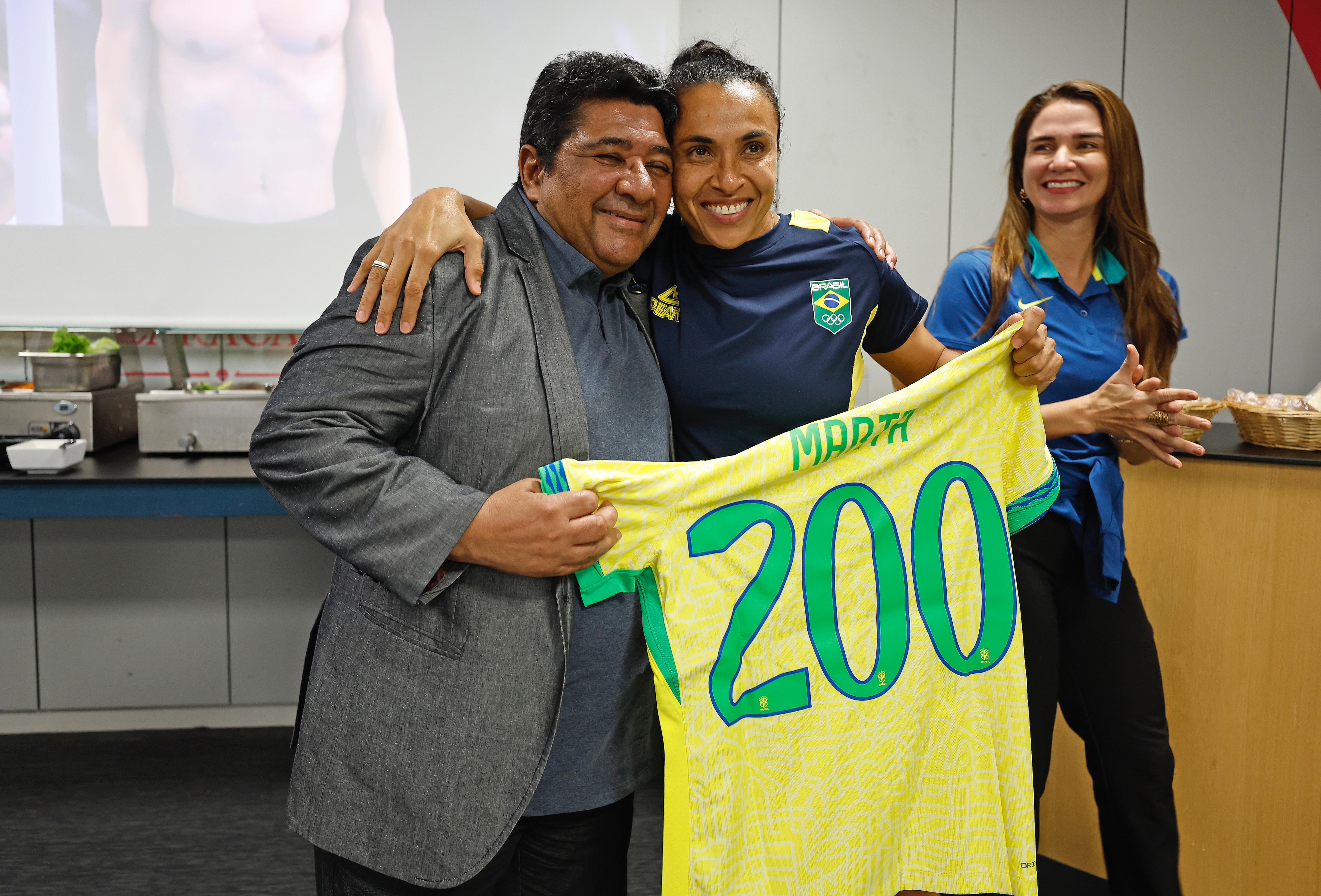 Durante as Olimpíadas, Marta recebeu uma camisa do presidente da CBF, Ednaldo Rodrigues, por seus 200 jogos pela Seleção.Créditos: Rafael Ribeiro/CBF