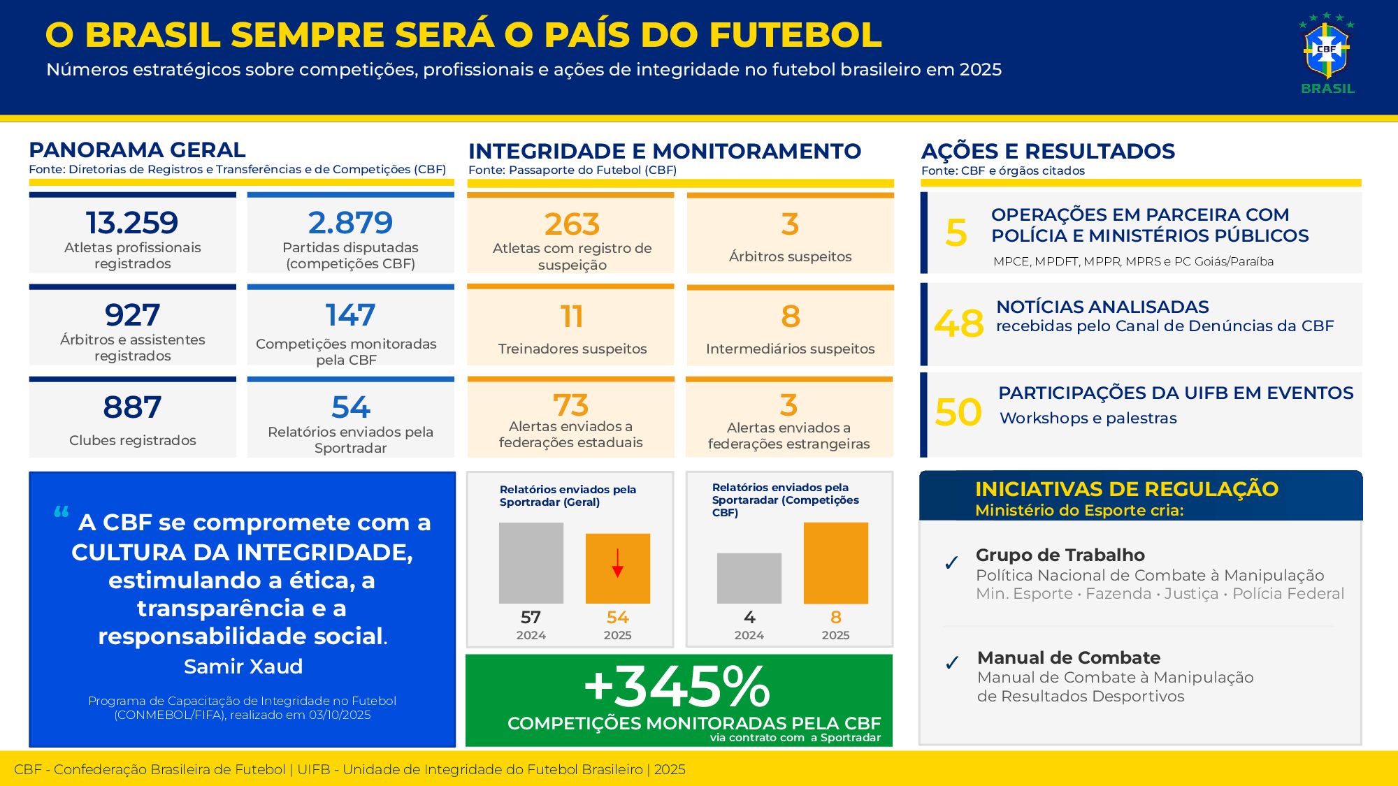 Números estratégicos sobre competições, profissionais e ações de integridade no futebol brasileiro em 2025 Créditos: CBF