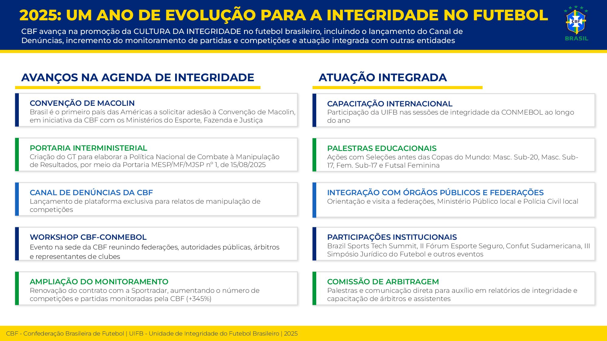 Cabe destacar, ainda, que a CBF apoiou o Governo Brasileiro no processo de solicitação de adesão do Brasil à Convenção de Macolin, reforçando o compromisso institucional com a prevenção e o combate à manipulação de competições esportivas.