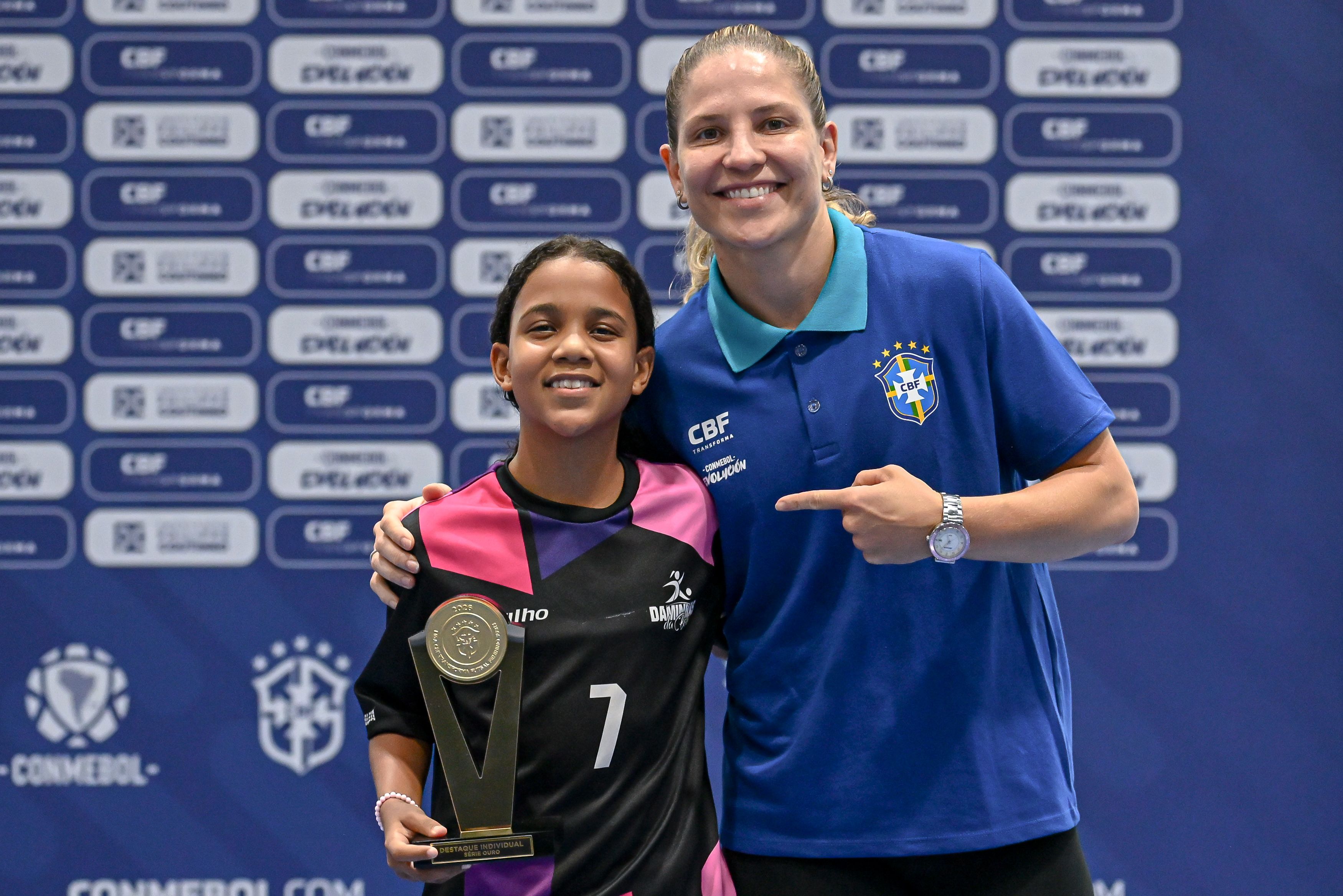 Atleta destaque da Série Ouro, Luany, das Daminhas da Bola, recebeu o troféu das mãos da embaixadora Bianca CastagnaroCréditos: Nayra Halm/Staff Images/CBF
