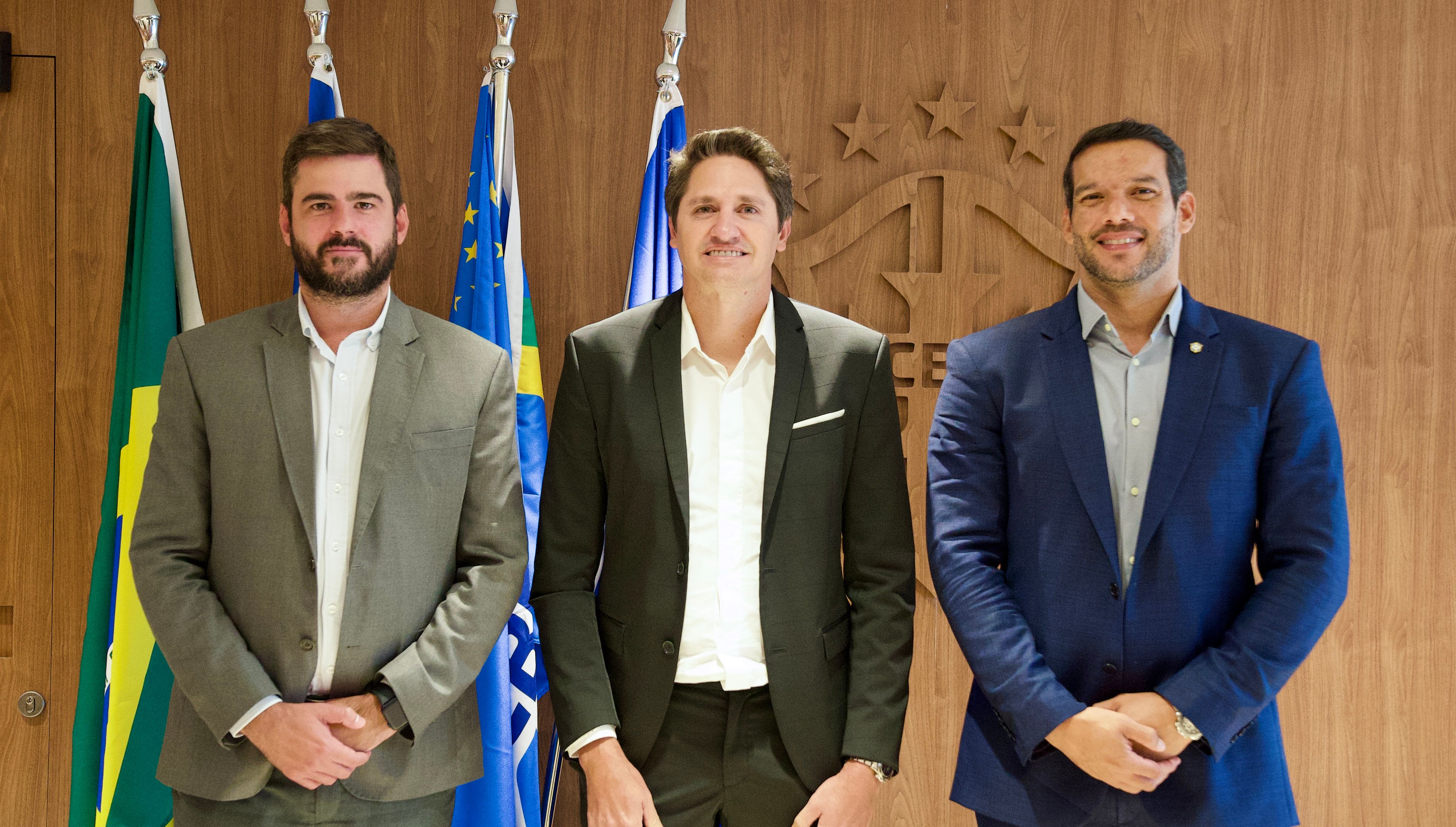 Diretor executivo da CBF, Helder Melillo, pentacampeão mundial em 2002 Edmilson e o presidente da CBF, Samir XaudCréditos: Samara Moumei/CBF