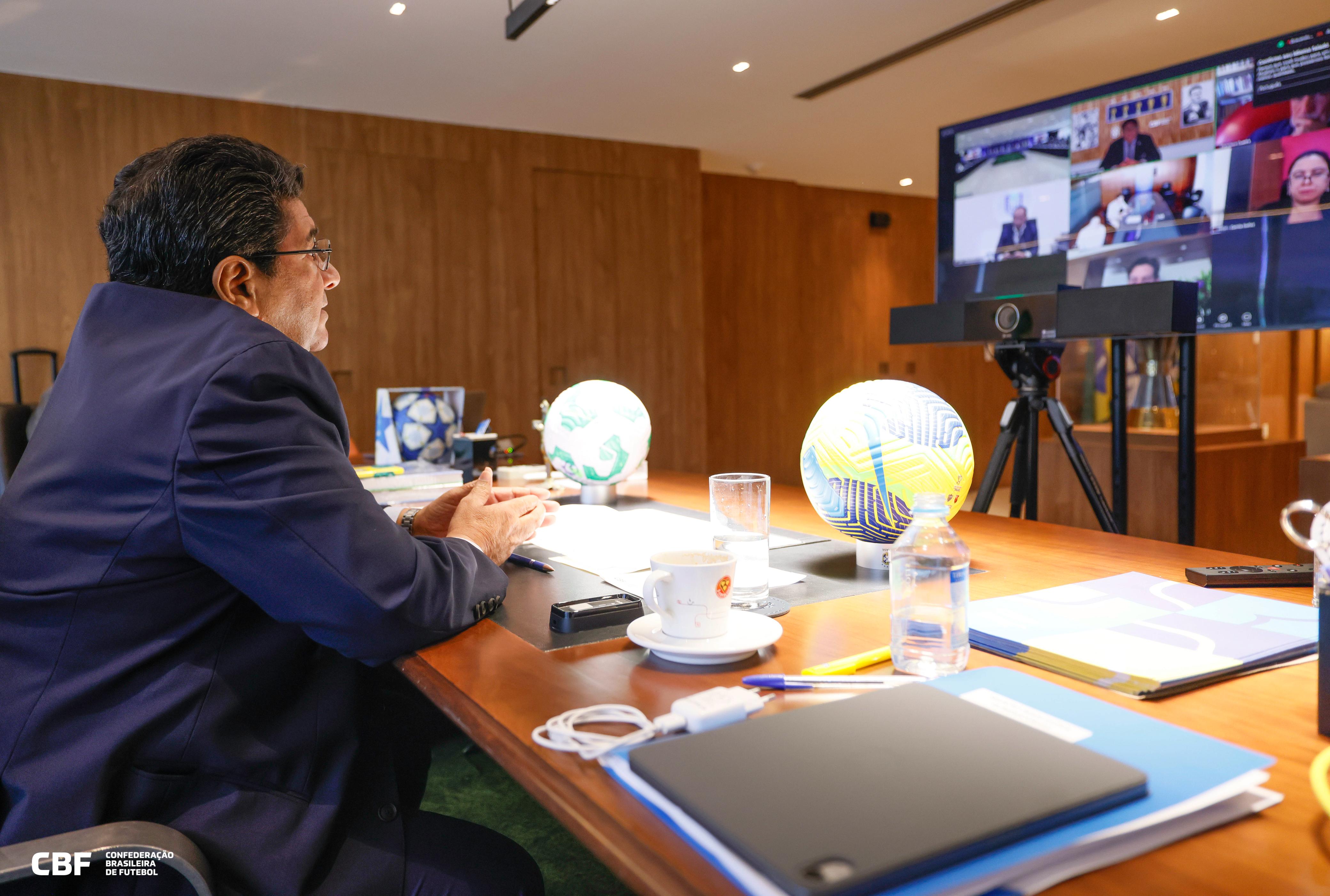O presidente da CBF, Ednaldo Rodrigues, participou nesta quinta-feira (27) da reunião realizada pela Conmebol para debater casos de racismo nas competições na América do Sul. O encontro durou mais de quatro horas e contou com a presença de autoridades de governo e representantes das associações dos dez países que compõem a Conmebol, além de ex-atletas. Ednaldo Rodrigues participou de forma remota na sede da CBF.