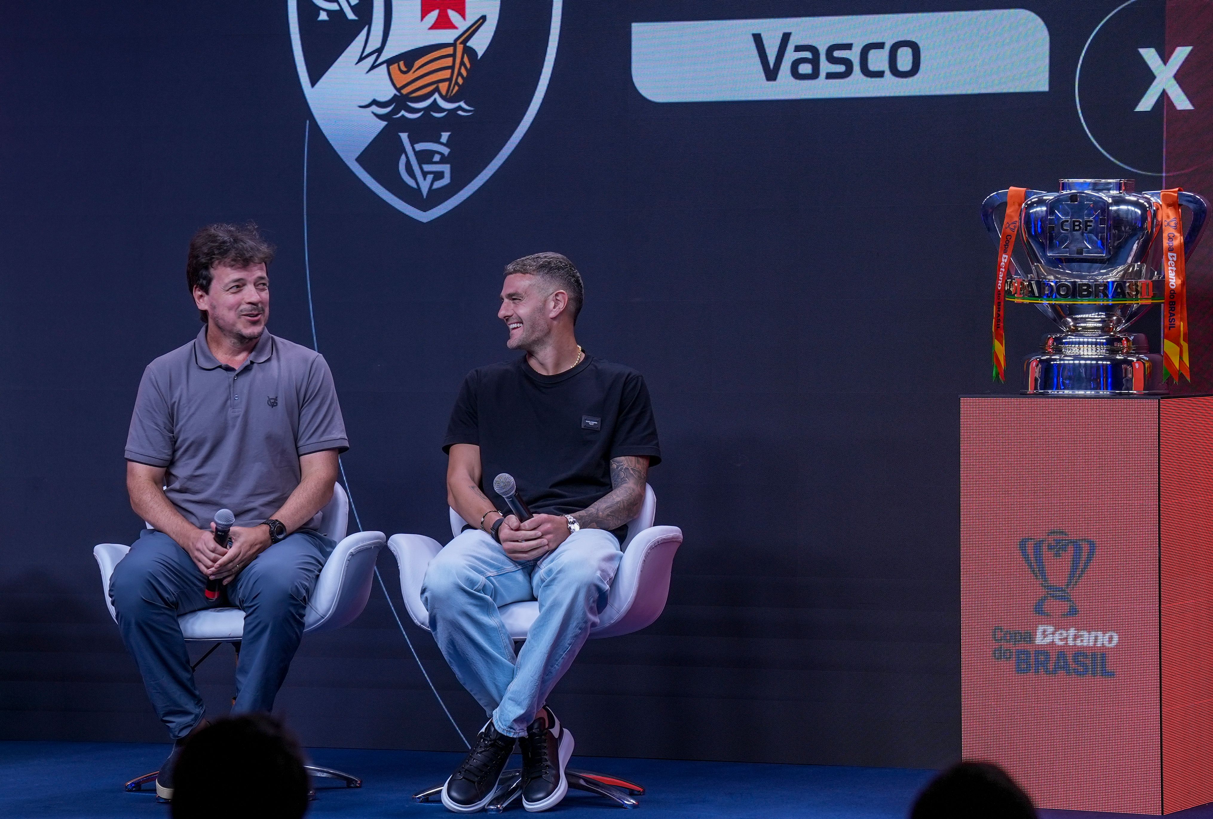 Fernando Diniz e Vegetti durante sorteio dos mandos de campo da Copa do BrasilCréditos: Nelson Terme/CBF