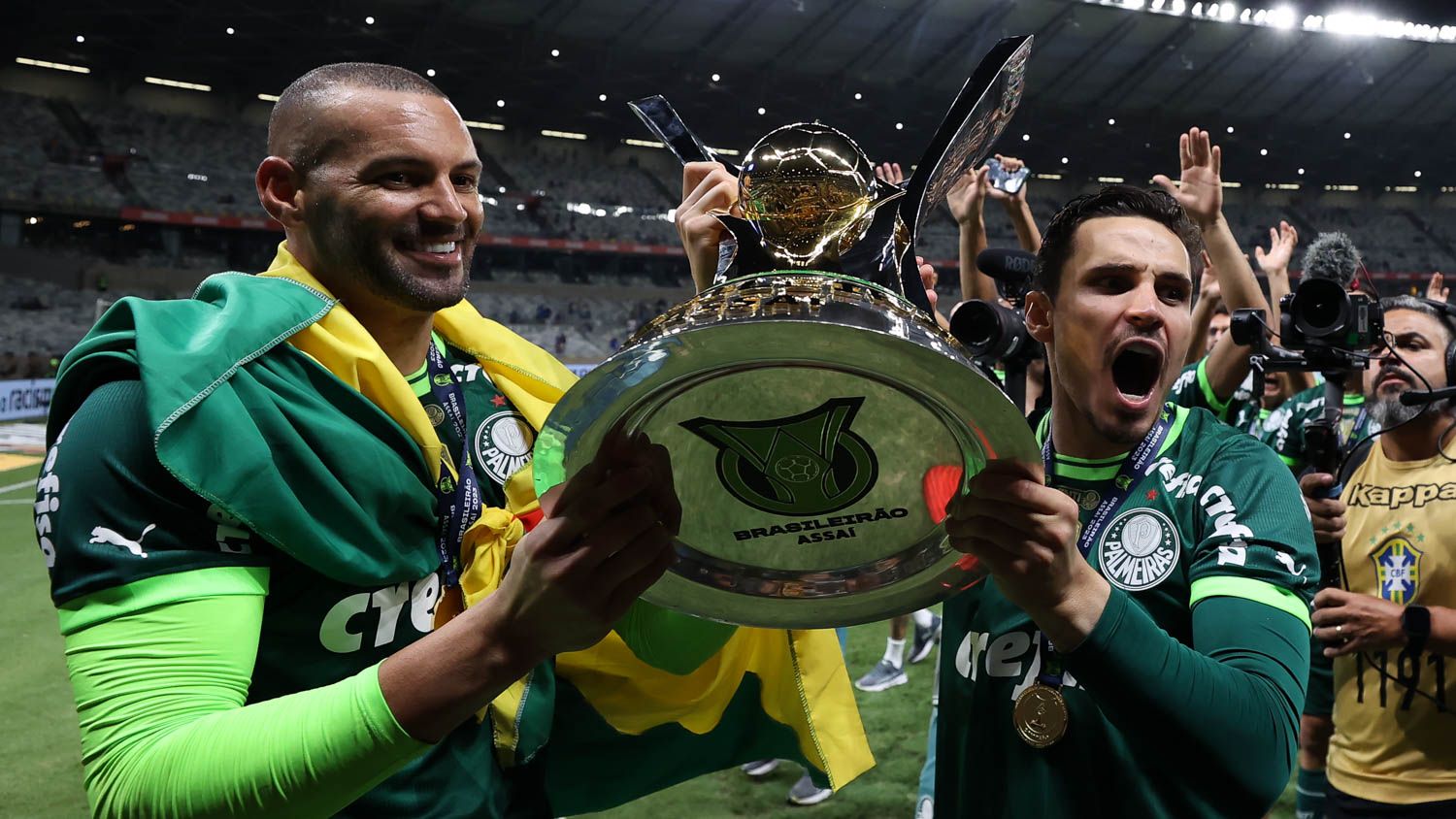 Weverton e Raphael Veiga com a taça da Série A de 2023Créditos: Cesar Greco/Palmeiras