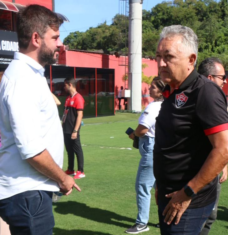 Helder Melilo conversa com Djalma Abreu, vice-presidente do VitóriaCréditos: Francisco Galvão / FBF