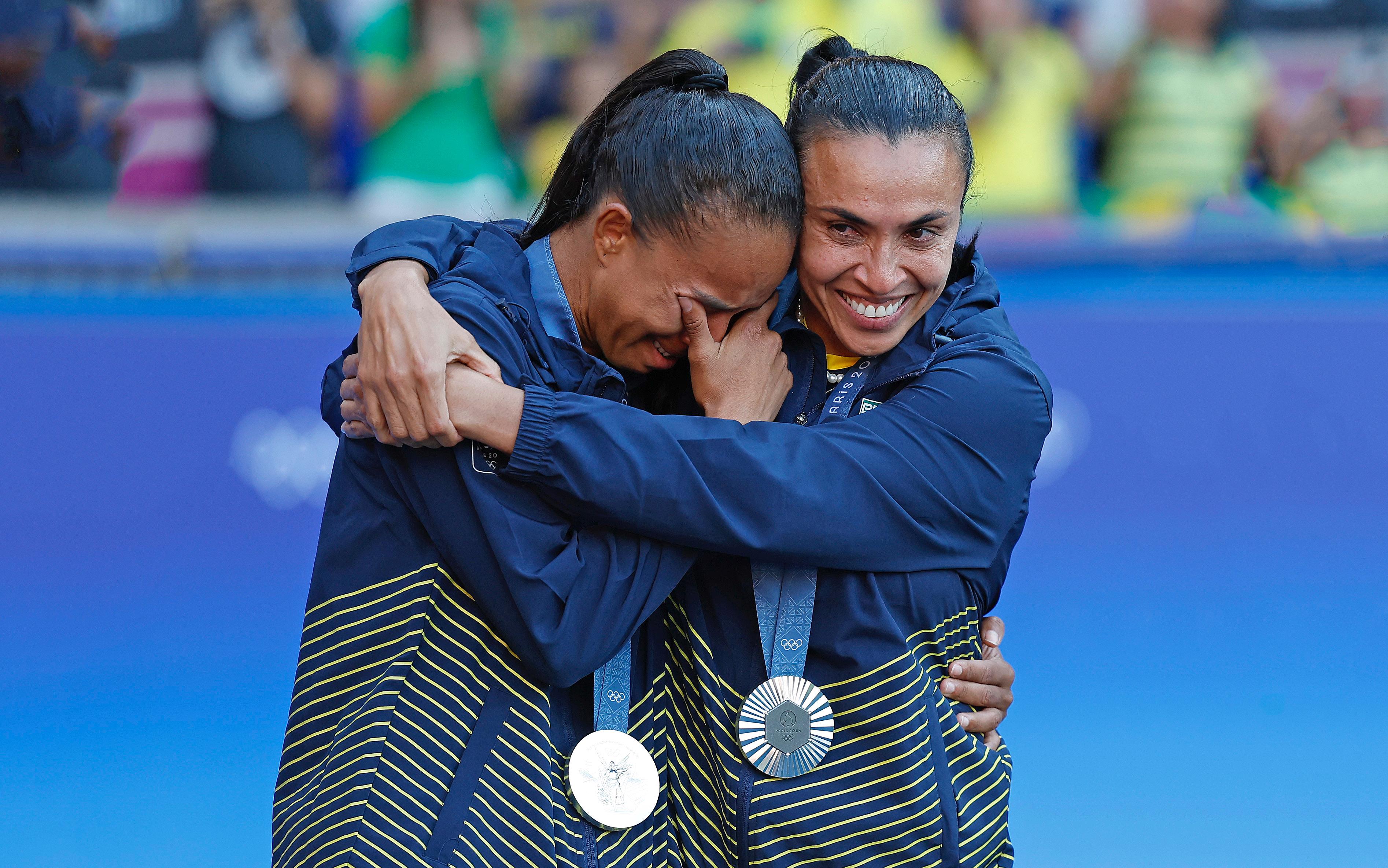 Marta consola Adriana, que chora, após receberem a medalha de prata dos Jogos Olímpicos de Paris 2024Créditos: Rafael Ribeiro/CBF
