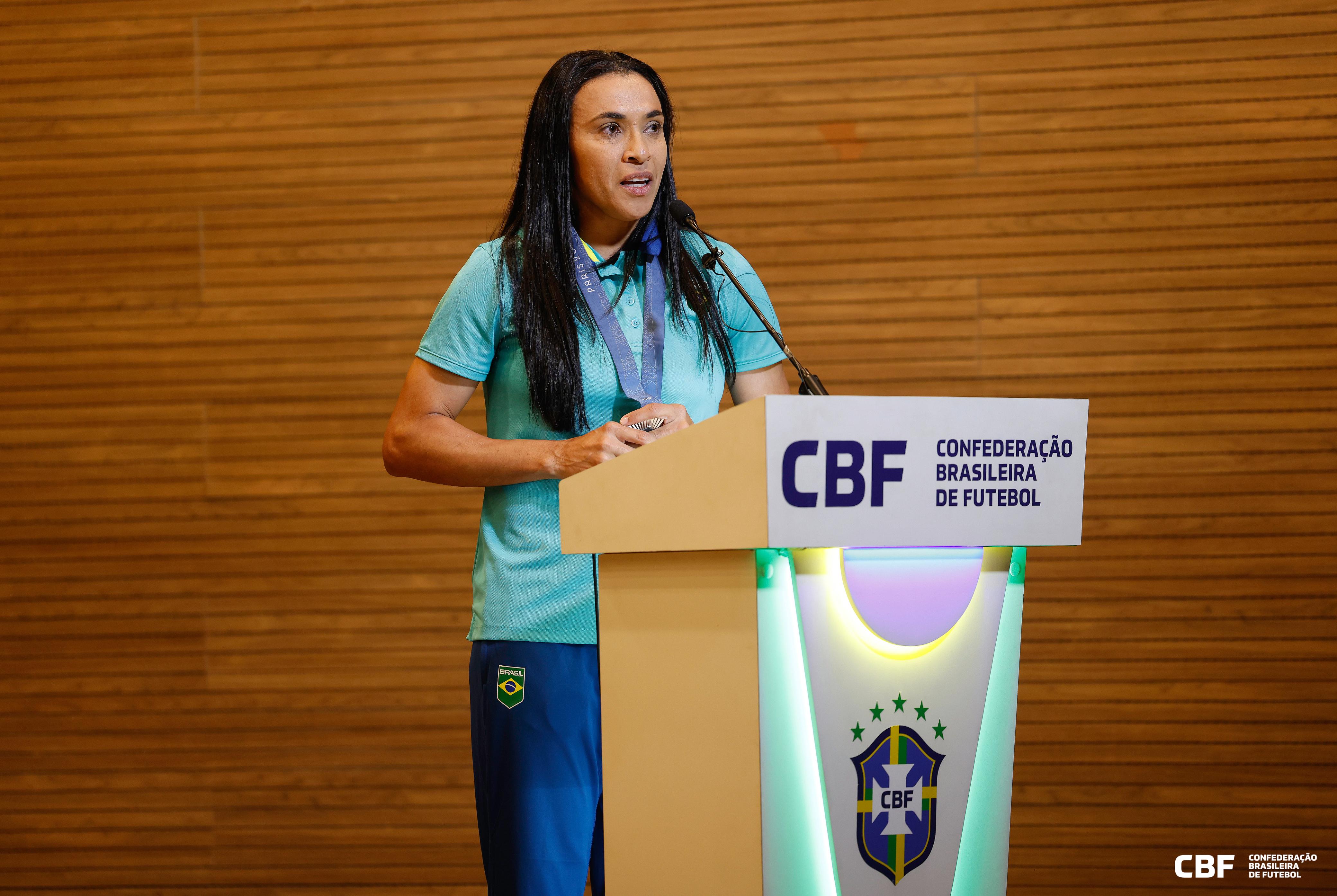 No evento promovido pela CBF em homenagem à conquista da medalha de prata nos Jogos Olímpicos de Paris 2024, Marta discursou no auditório da sede da entidade, nesta segunda-feira (12). Ela destacou a força do futebol feminino brasileiro, que, segundo a maior jogadora de todos os tempos, "voltou a ser respeitado" mundialmente após a campanha na França.