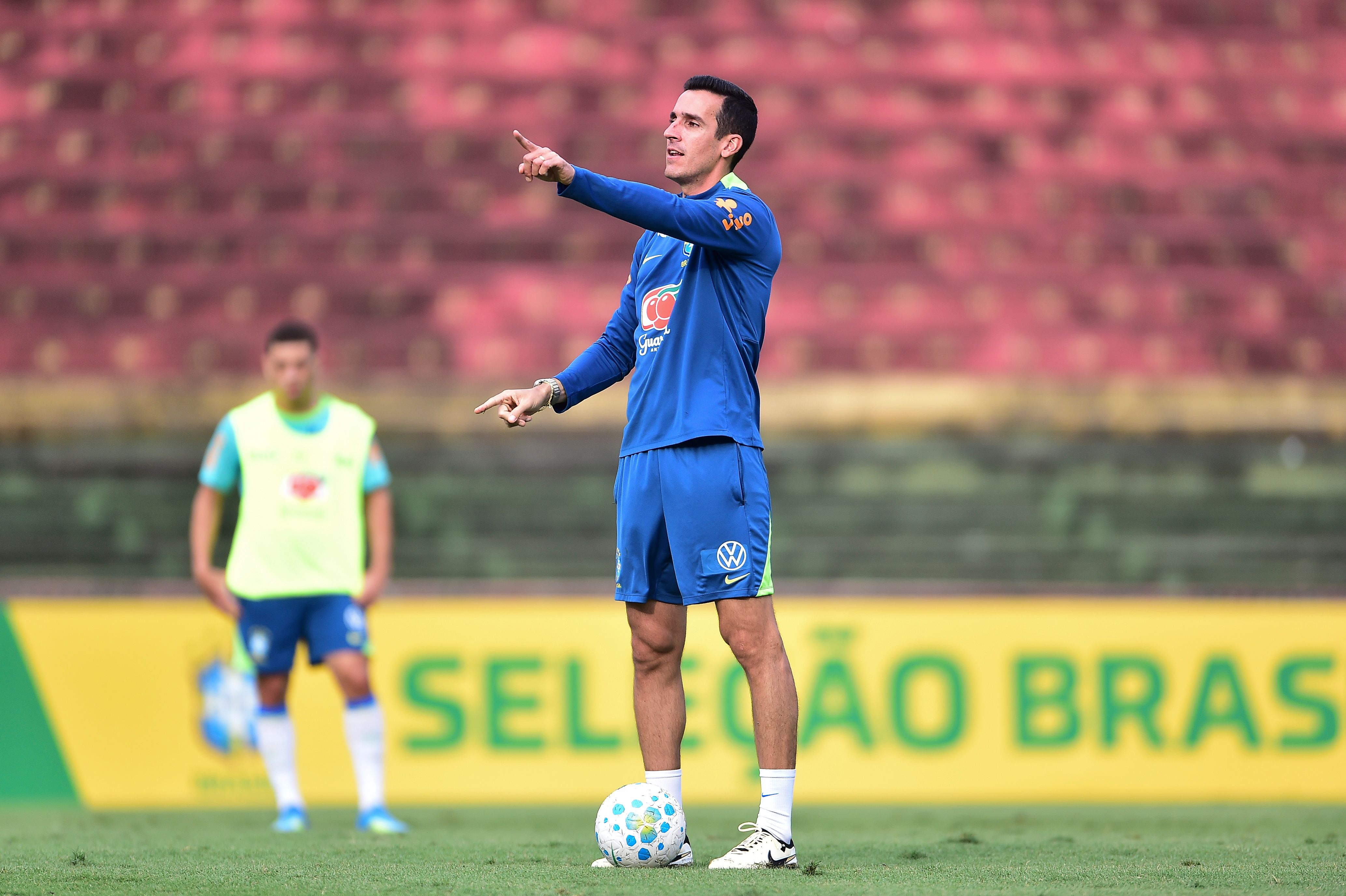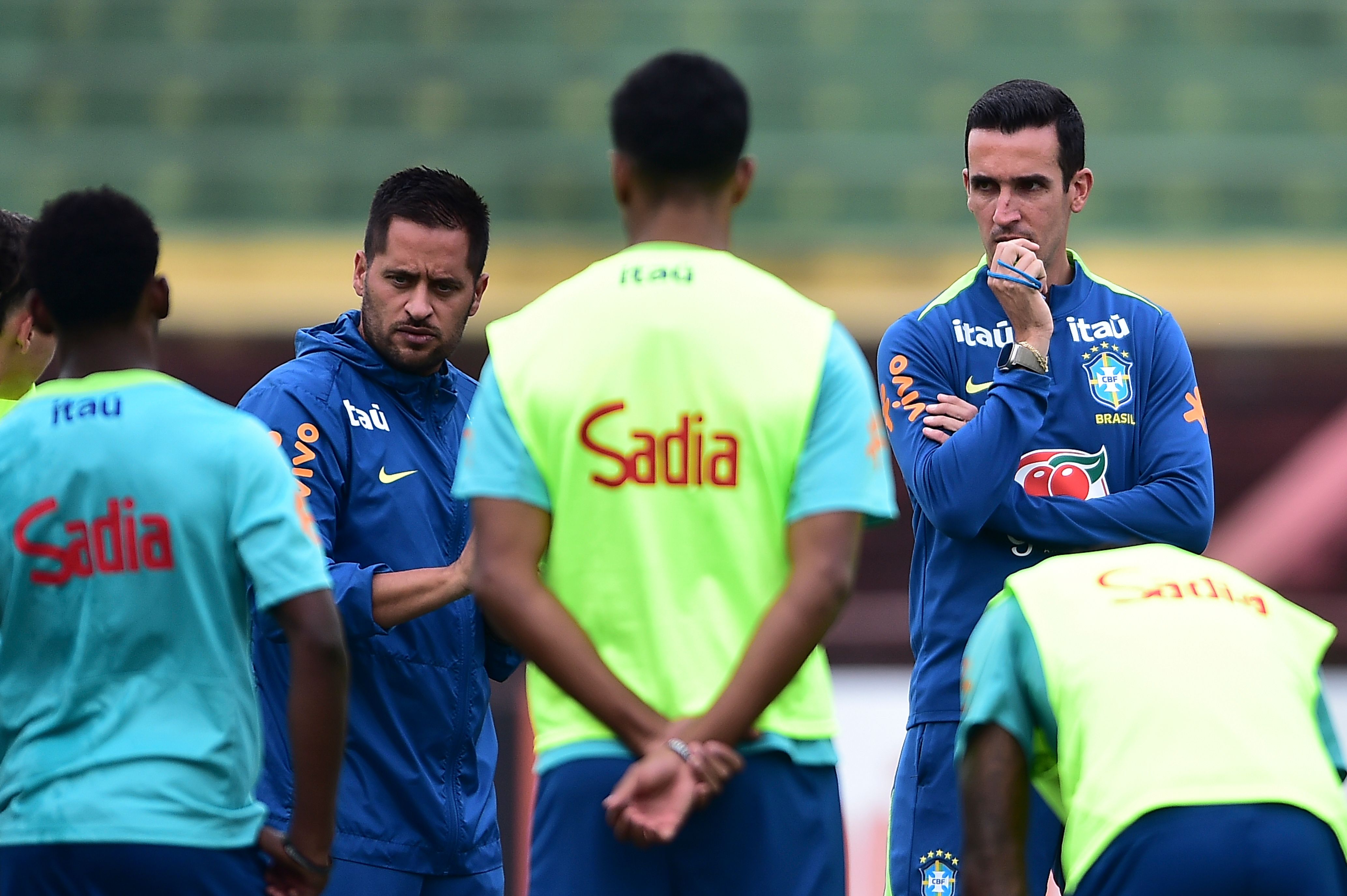O auxiliar Lucas Andrade e o técnico Paulo Victor conversam com o grupo durante o treino no Canindé: período de trabalho uniu atividades e observaçãoCréditos: Staff Images / CBF
