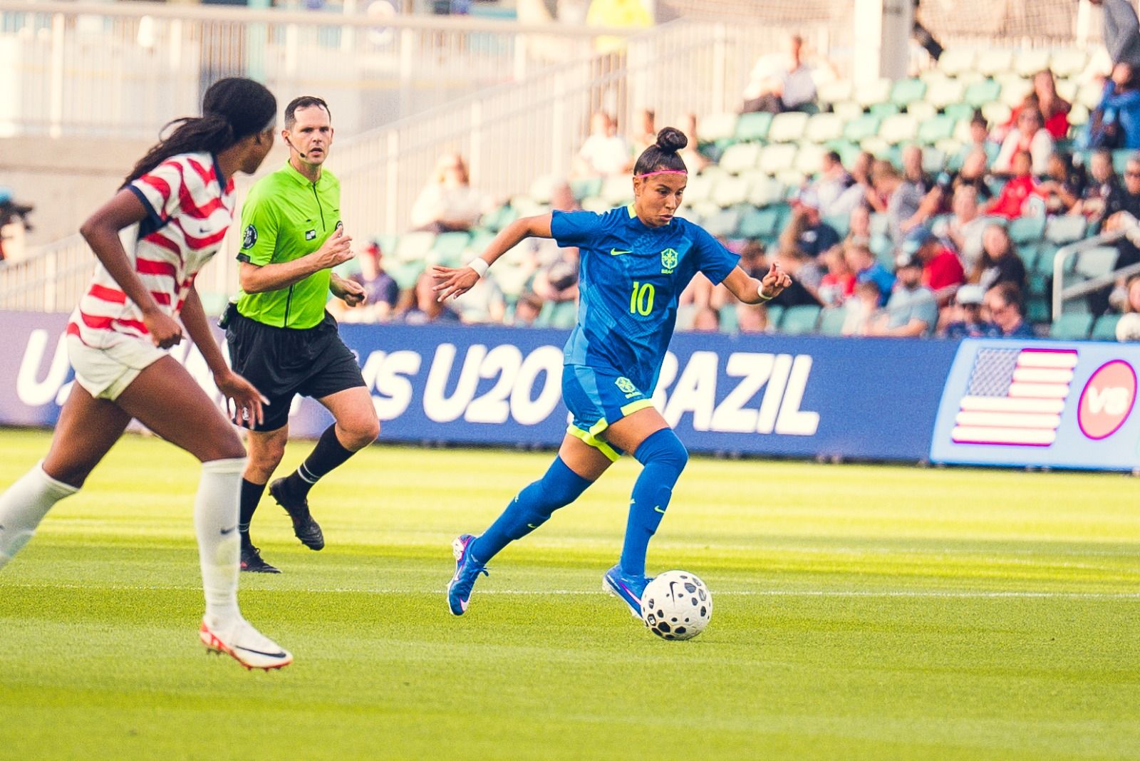 O Brasil conseguiu criar as primeiras boas oportunidades com Tainá, que apareceu com perigo em duas finalizações de média distância, levando perigo à defesa norte-americana e mostrando personalidade no setor ofensivo.