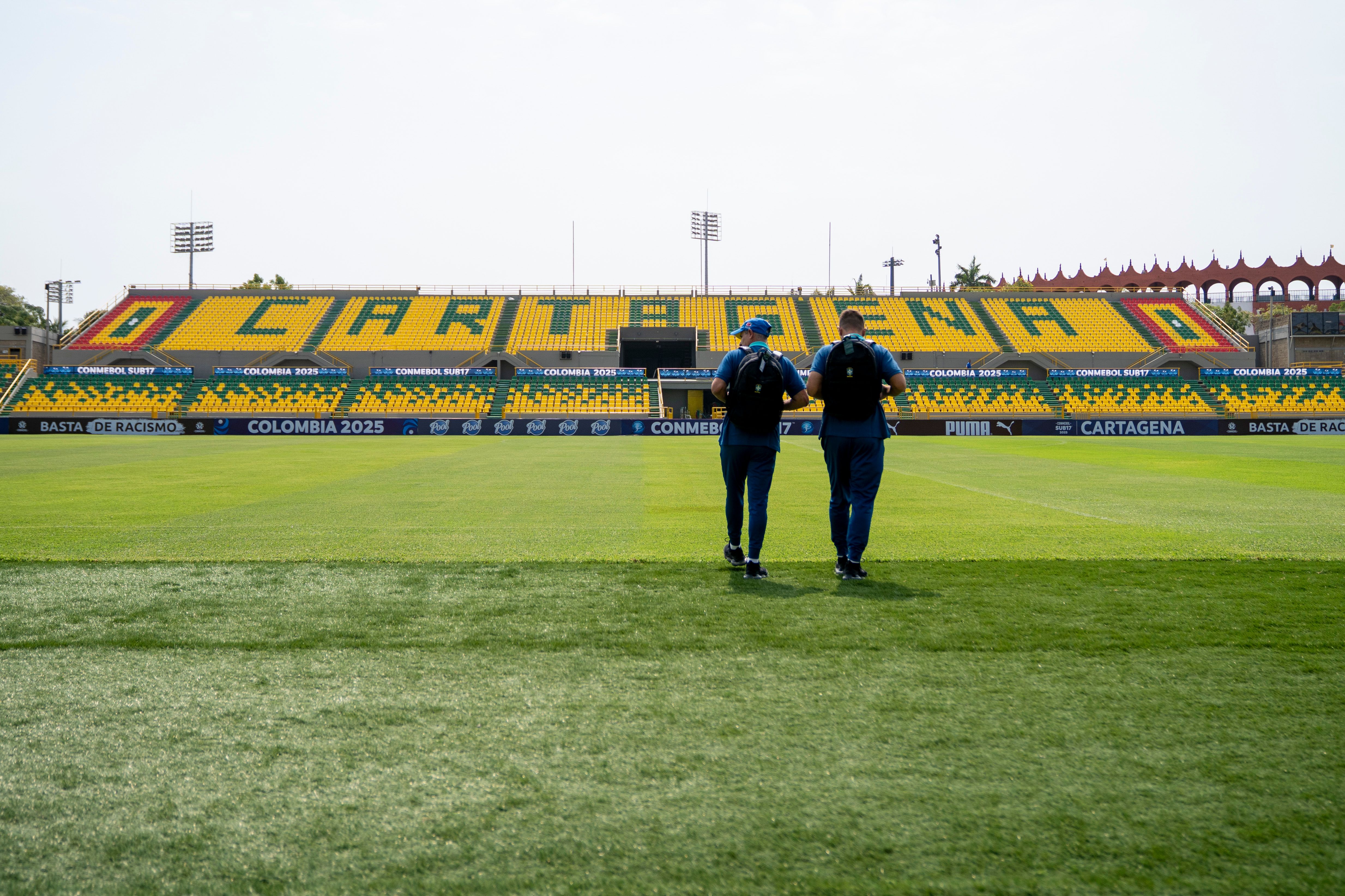 Nelson Terme/CBFNesta quinta-feira (27), a Seleção Sub-17 foi até o estádio Olímpico Jaime Morón León, em Cartagena (COL), para fazer o reconhecimento de campo. O estádio será palco de todos os jogos do Brasil na fase de grupos do Sul-Americano.