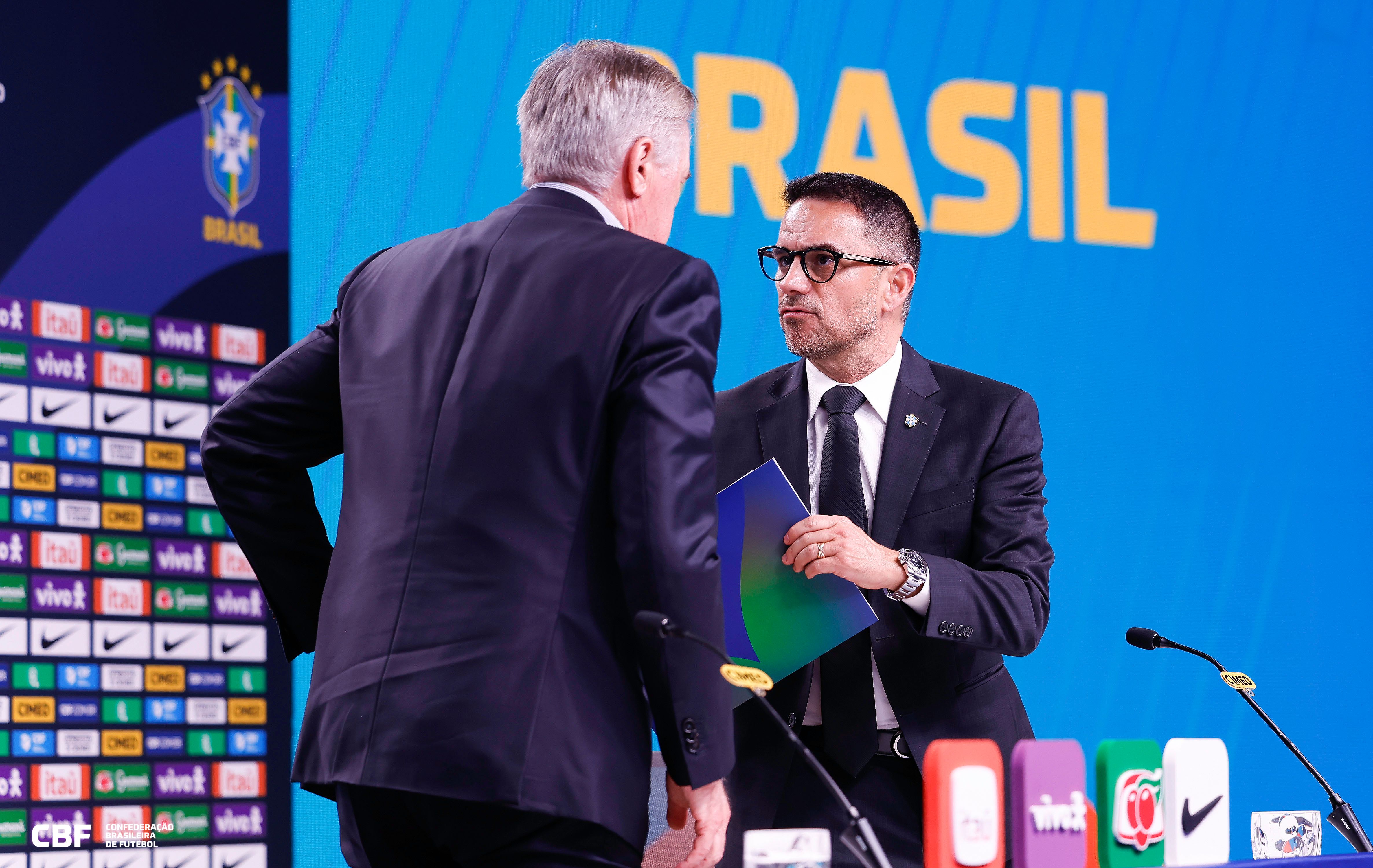 Rodrigo Caetano conversa com Carlo Ancelotti na convocação para os jogos com Coreia do Sul e JapãoCréditos: Rafael Ribeiro / CBF