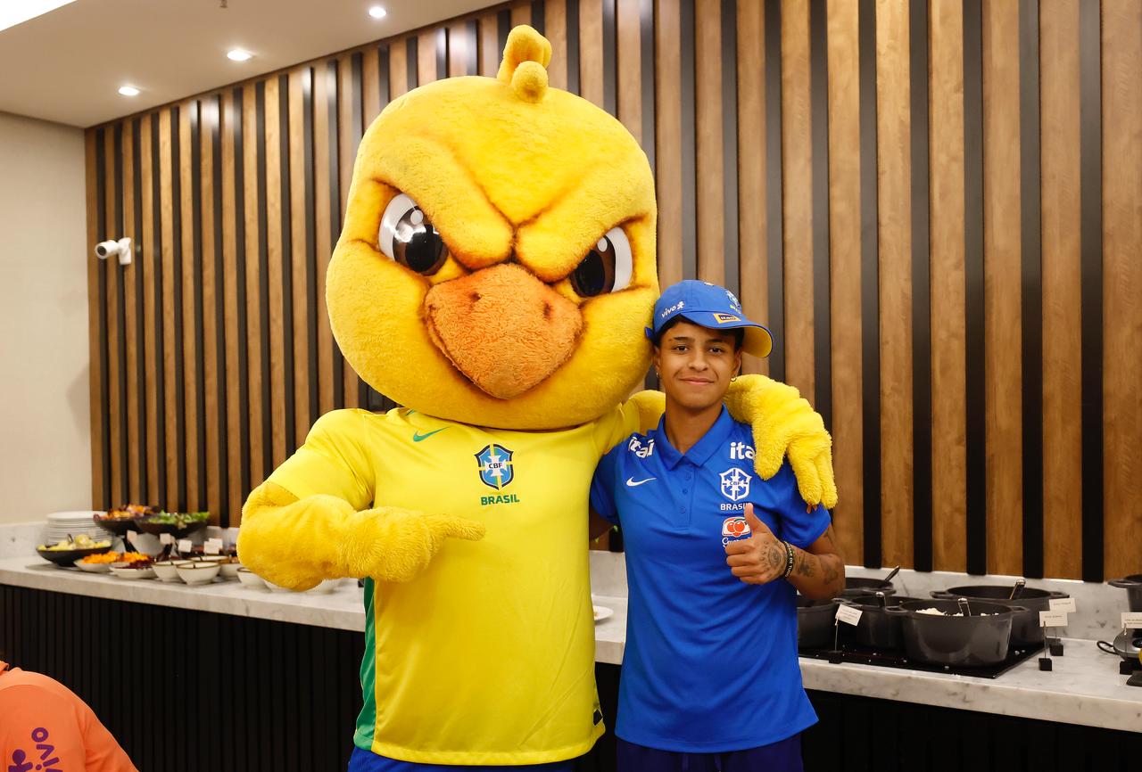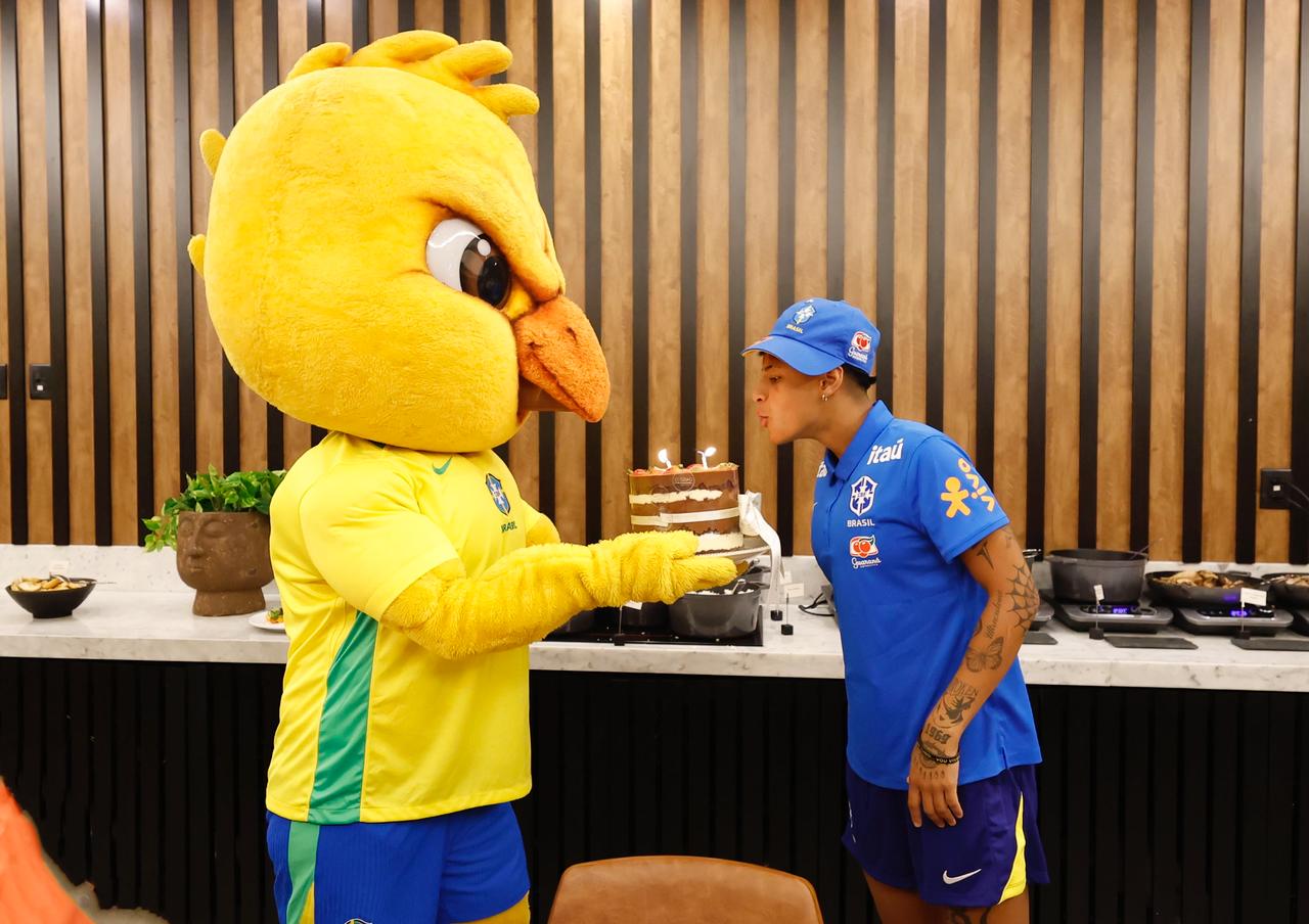 Rafa Rocha comemorou seu aniversário de 18 anos com a Seleção Brasileira Feminina Sub-20 e teve direito a uma celebração especial na noite desta quarta-feira (22): recebeu o bolo e os parabéns do mascote da Amarelinha, o Canarinho.
