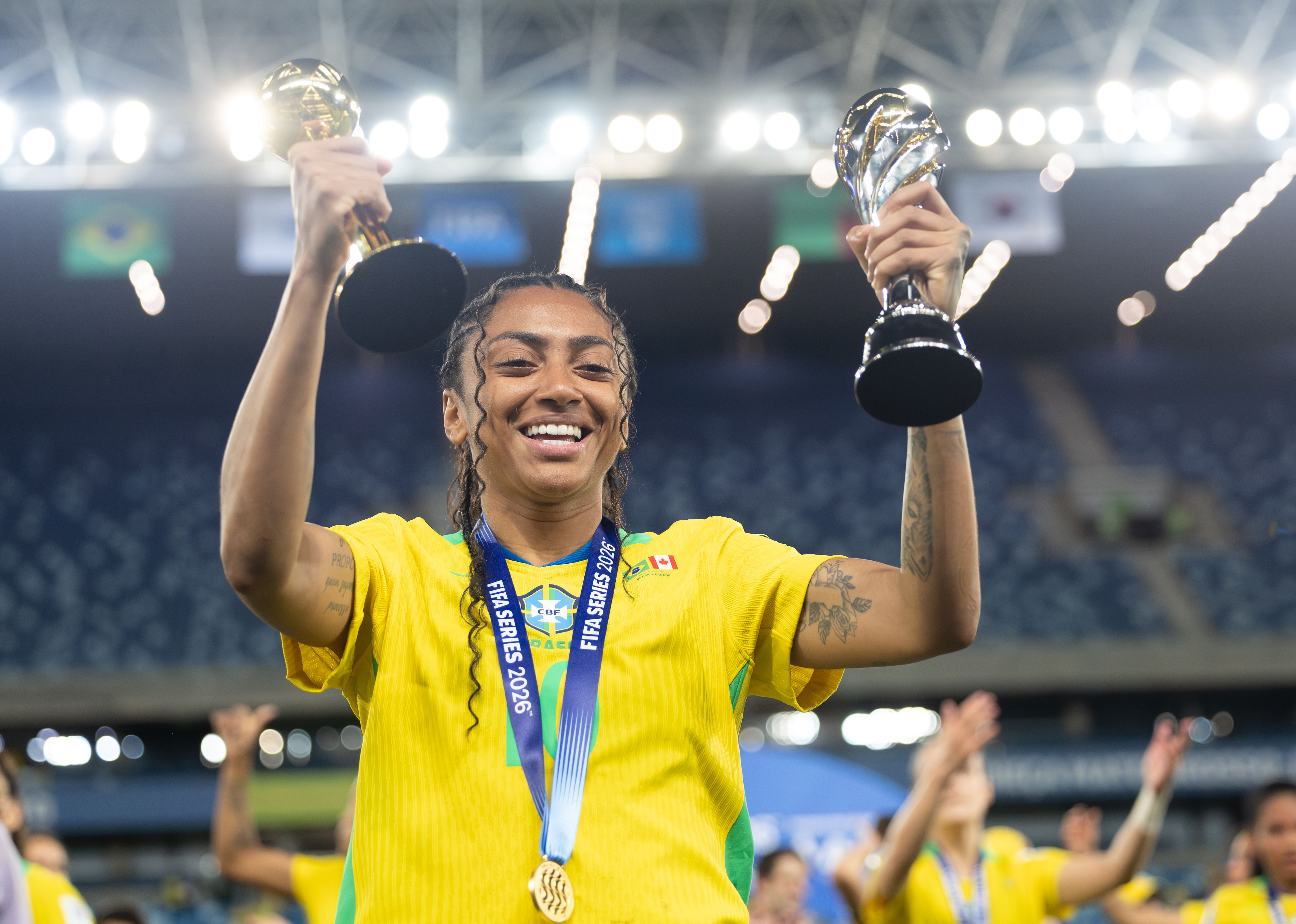 Kerolin celebra conquista do FIFA Series e o prêmio de melhor jogadora da competiçãoCréditos: Lívia Villas Boas/CBF