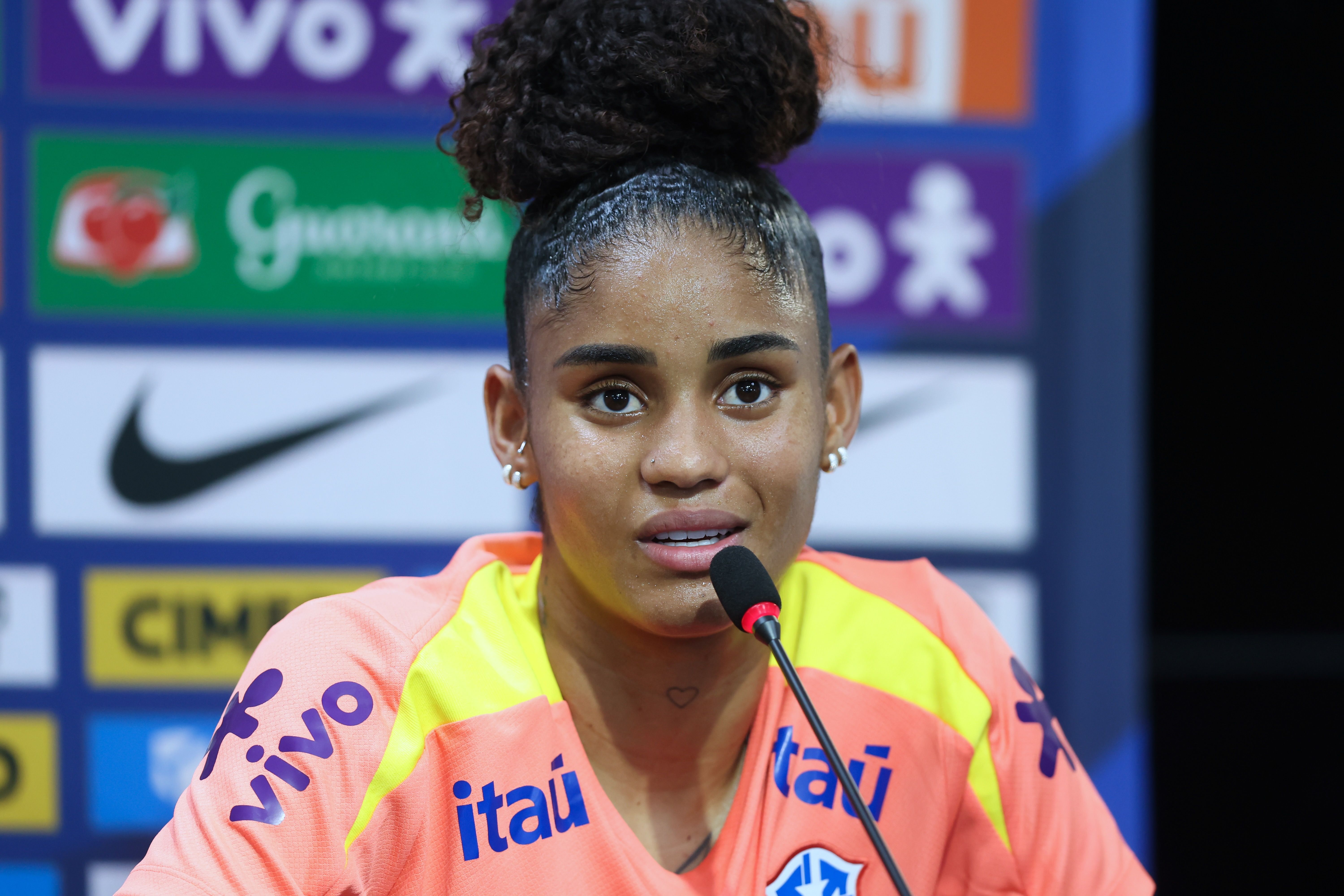 Tarciane em entrevista coletiva após treino da Seleção BrasileiraCréditos: Lívia Villas Boas / Staff Images Woman / CBF
