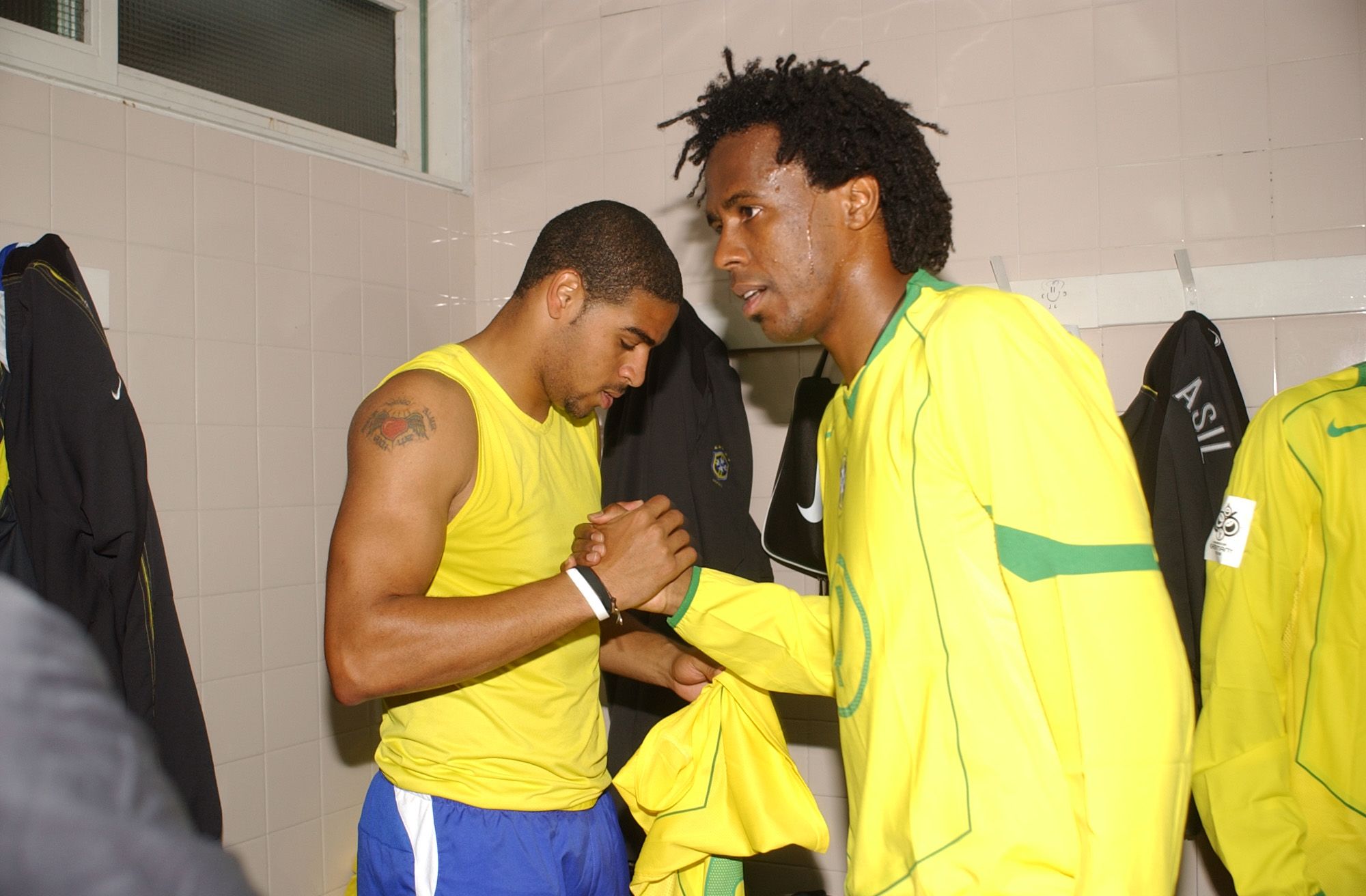 Roque Júnior cumprimenta Adriano após jogo da Seleção contra a Argentina, em Buenos AiresCréditos: Arquivo CBF
