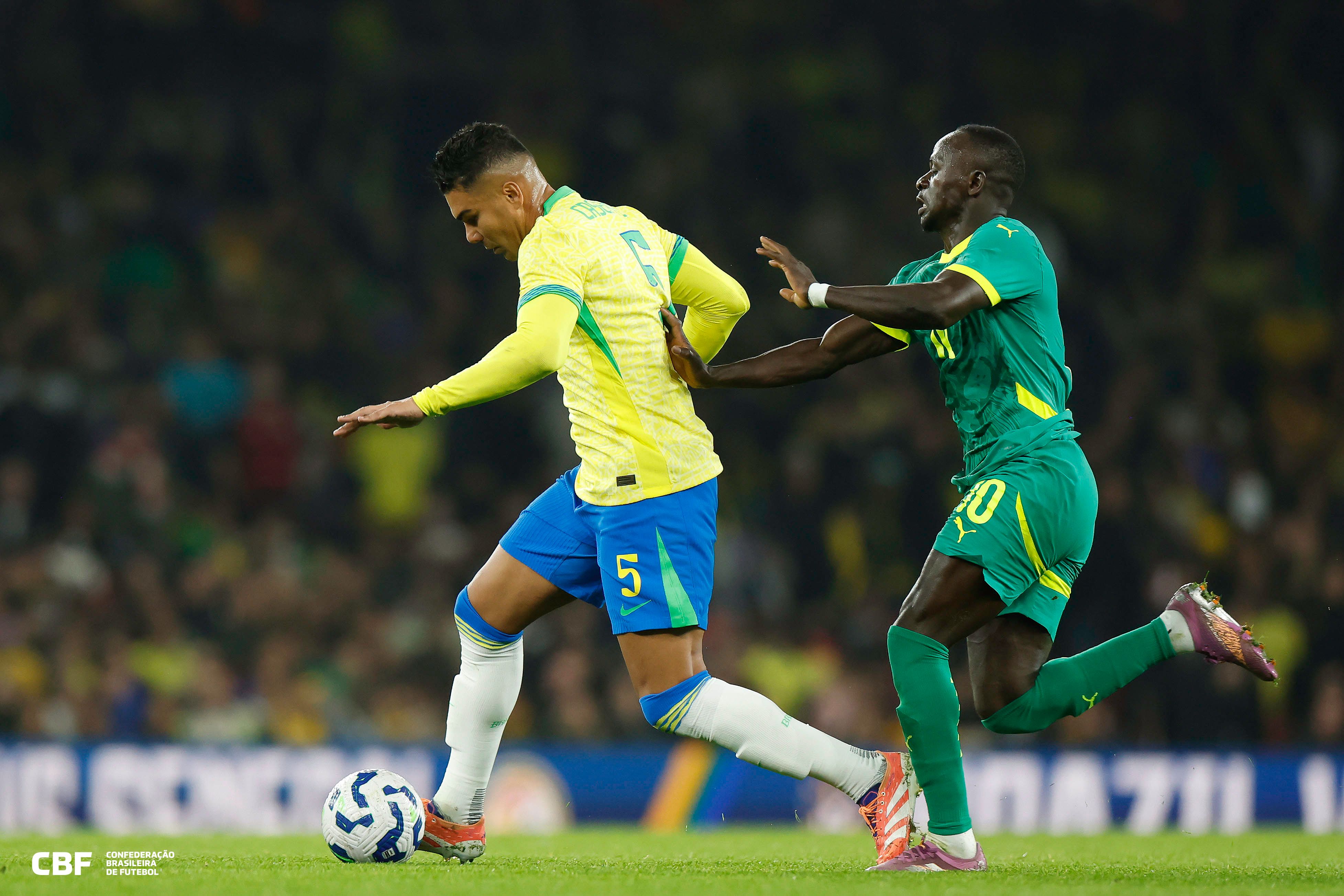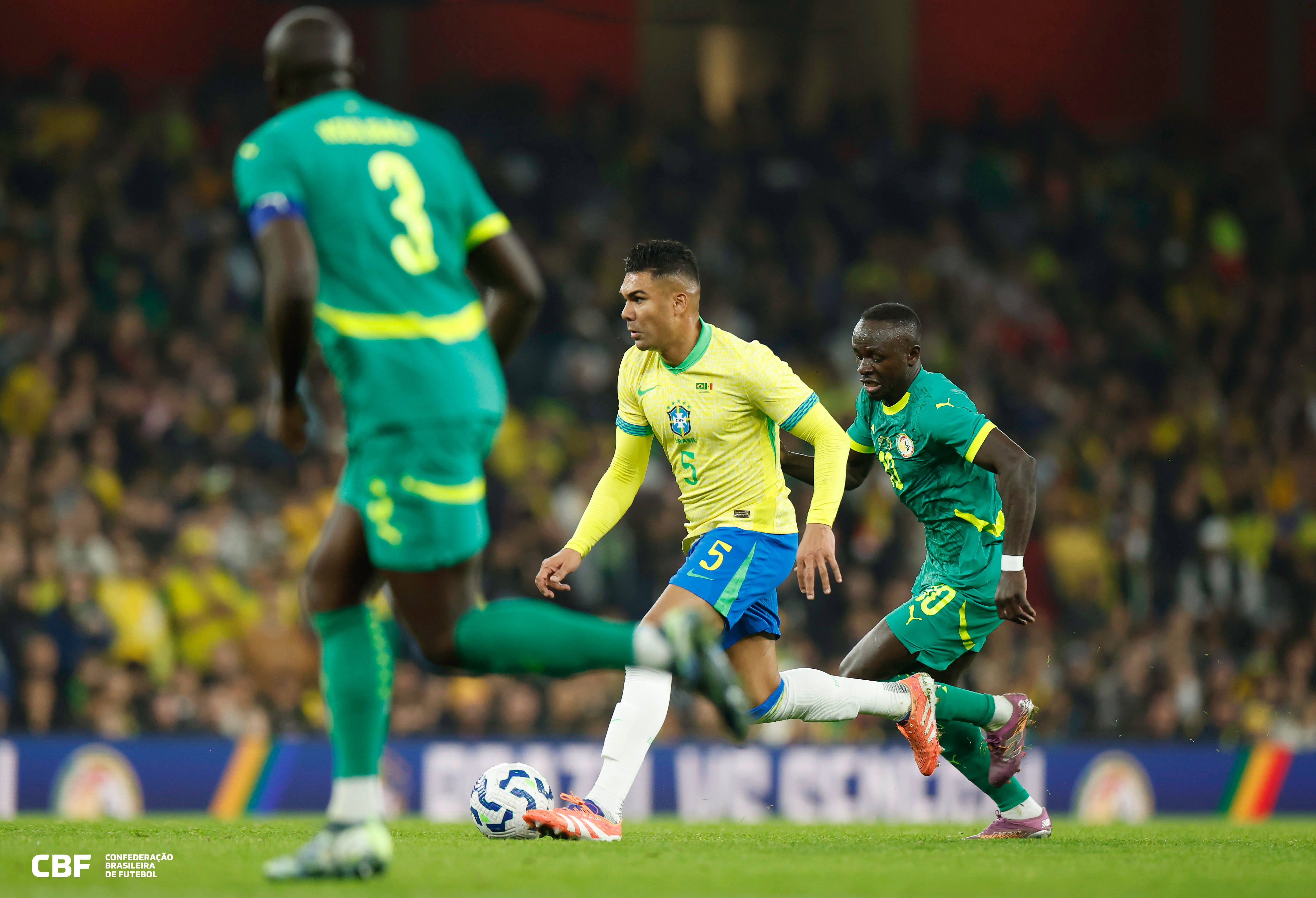 Casemiro em ação durante a vitória por 2 a 0 sobre Senegal, no Emirates Stadium, em LondresCréditos: Rafael Ribeiro / CBF