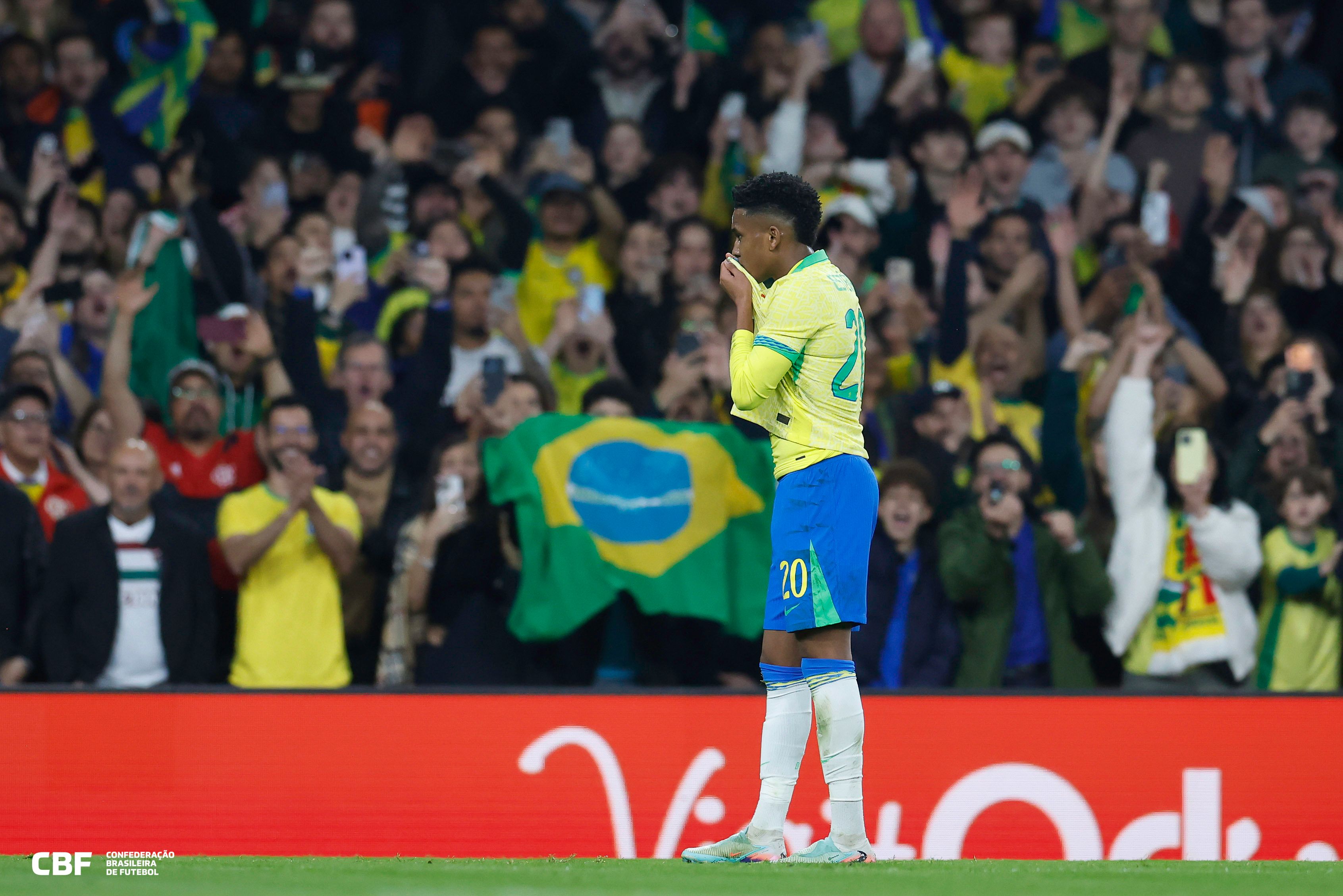 Estêvão celebra gol pela Seleção sobre Senegal, no Emirates Stadium, em LondresCréditos: Rafael Ribeiro / CBF
