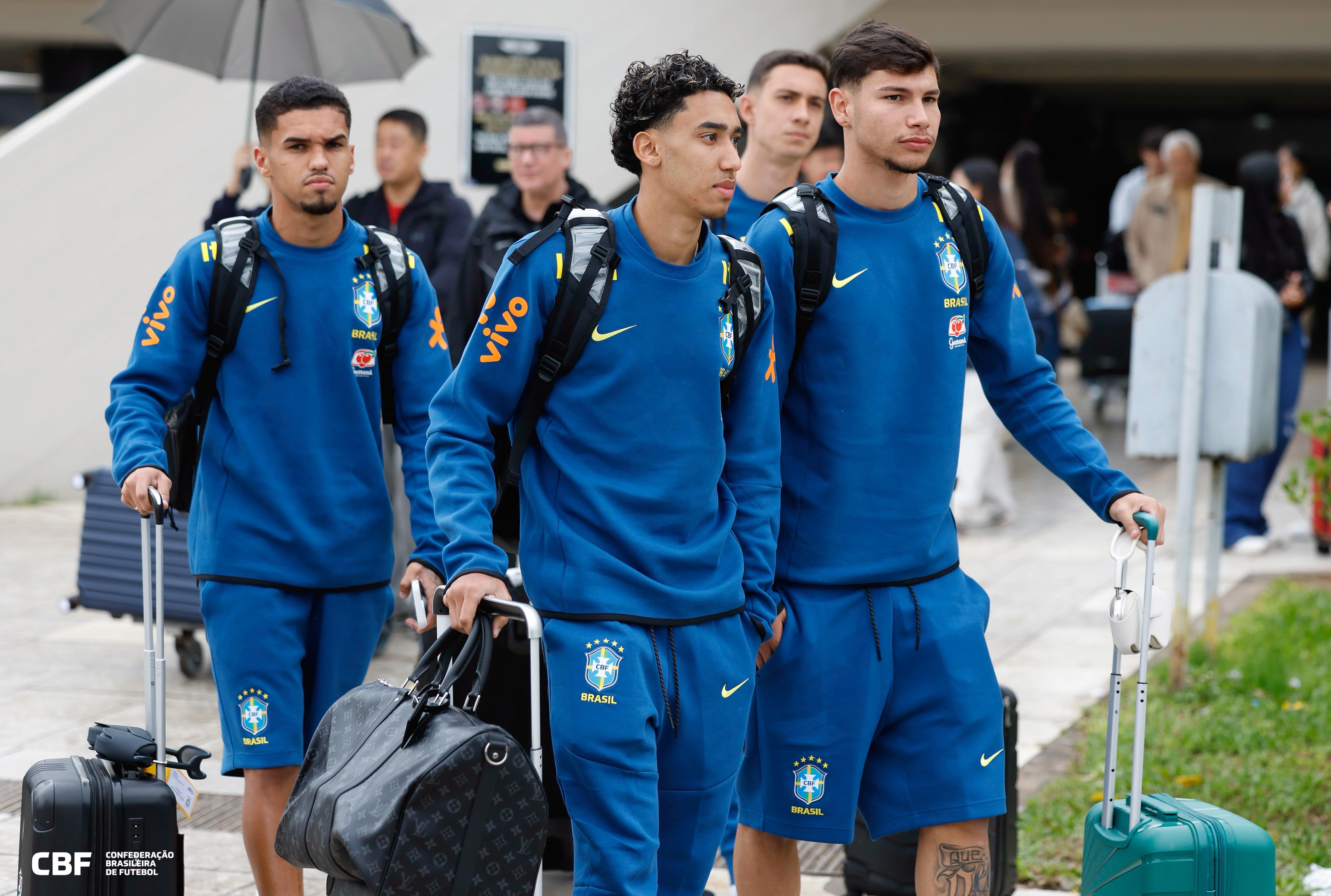 Riquelme Felipe, Isaque e Erick Belé na chegada da Seleção Sub-20 ao ParaguaiCréditos: Rafael Ribeiro/CBF