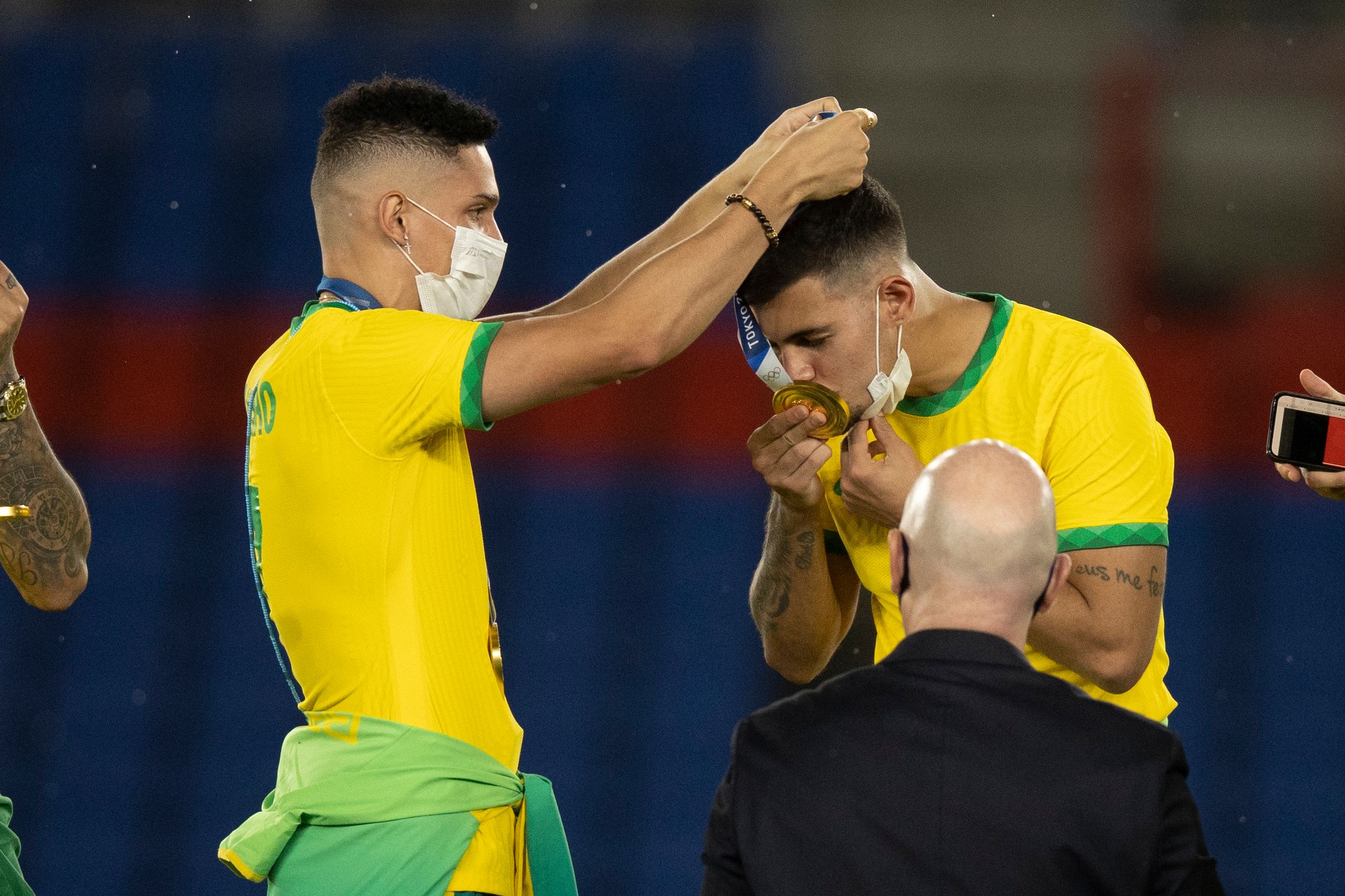 Bruno Guimarães beija a medalha de ouro dos Jogos Olímpicos de Tóquio 2020Créditos: Lucas Figueiredo / CBF