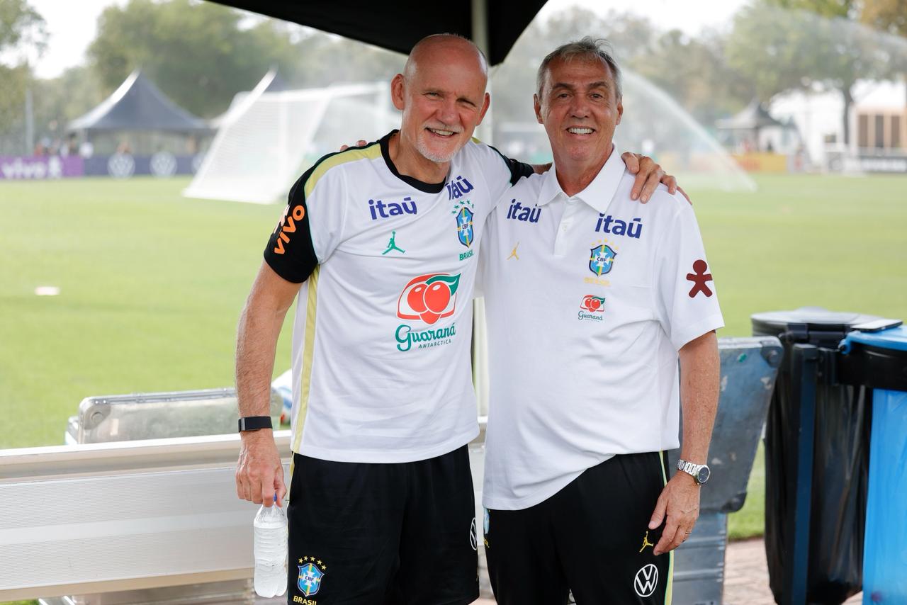 Tetracampeão Taffareal e o presidente da Federação Pernambucana, Evandro Carvalho, em treino da Seleção em OrlandoCréditos: Rafael Ribeiro/CBF
